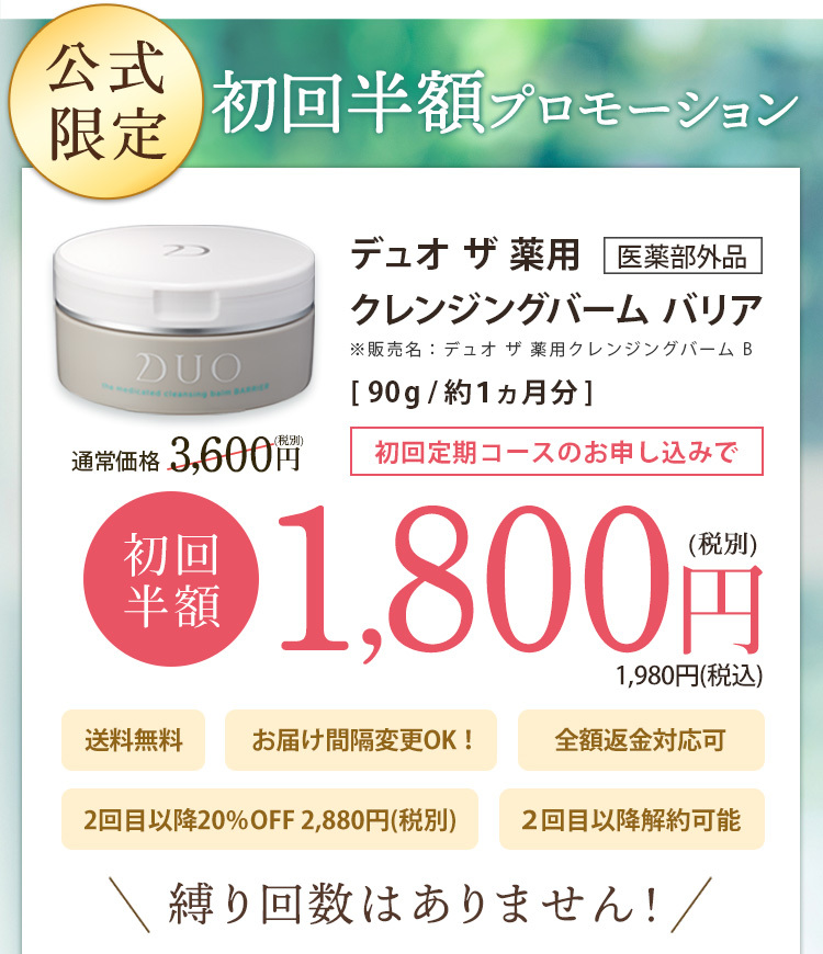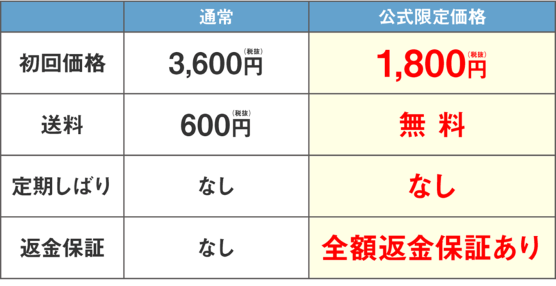 今、定期購入なら、初回購入50%OFF3600円⇒1800円半額プロモーション中!2回目以降も20%OFF2880円で購入可能