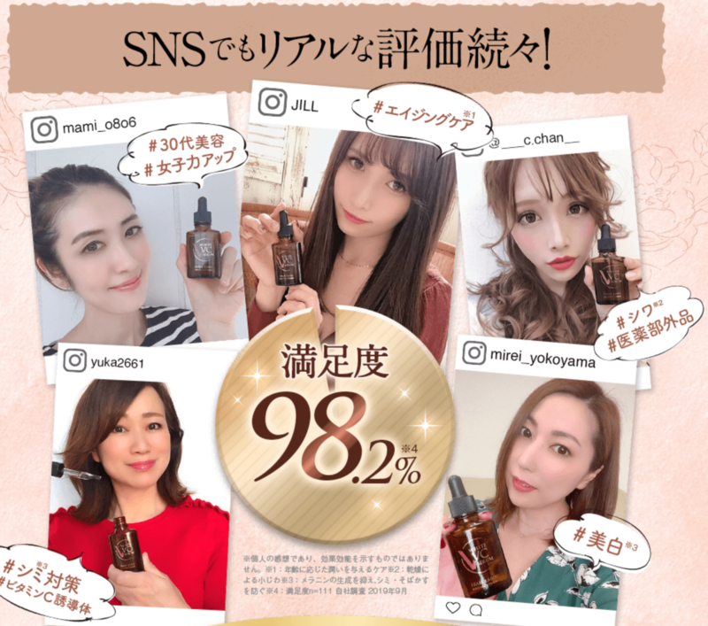 「ホワイトVCセラム」は、効果効能が評価されSNSや雑誌でかなり話題を呼んでいて満足度は98.2%とかなり高いです。