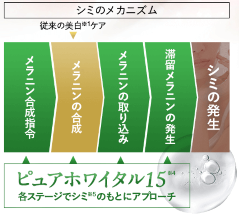 従来の美白ケアは、メラニンの合成にアタックしていましたが、『ピュアホワイタル15』は、加えてシミが生成される各ステージでそれぞれブロック機能果たす15種の美肌サポートをしてくれます。