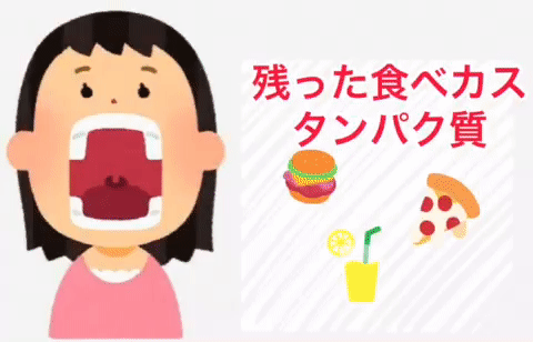 口の中に残っているタンパク質(食べかす)を細菌が分解するときにニオイを放ちます!💦